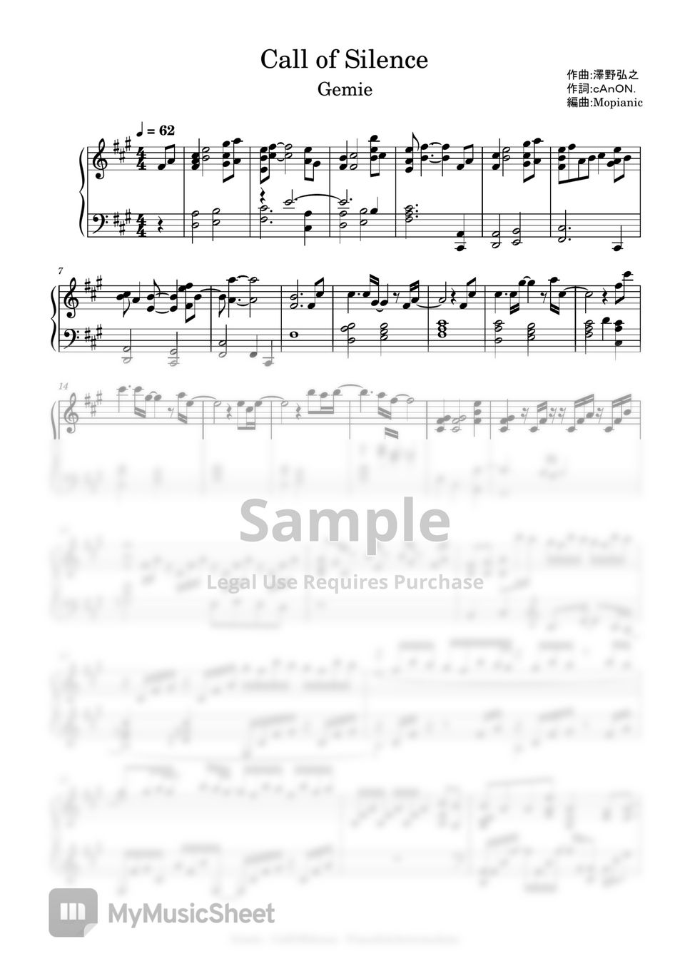 The document provides details about a piano score titled 'call of silence' arranged by animenz from the anime attack on titan, composed by hiroyuki sawano. Download and print call of silence (arr. Sheet music of call of silence piano (by original music by hiroyuki sawano), piano arrangement and chords, download to print free pdf sheet (10 pages) piano,. Mopianic) sheet.