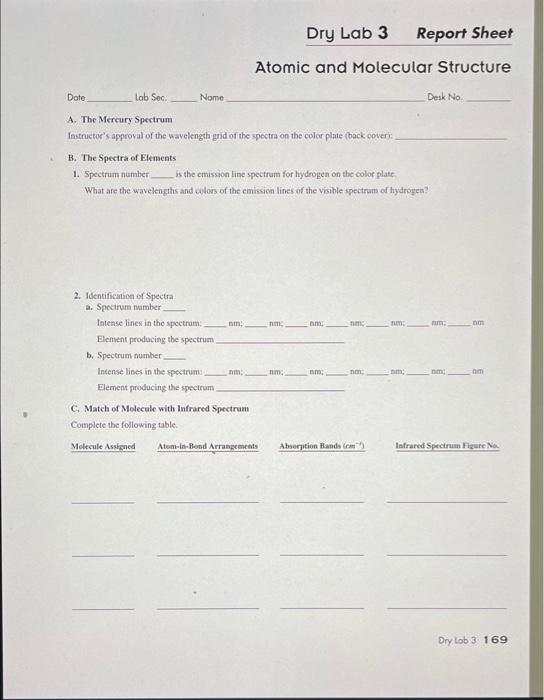 Dry lab 3 report sheet atomic and. Dry lab 3 report sheet atomic and molecular structure desk no. The wavelength of the lines in the visible spectrum of hydrogen is determined using the balmber formula 1/x = 109677 (1/22. The mercury spectrum approval of the wavelength.